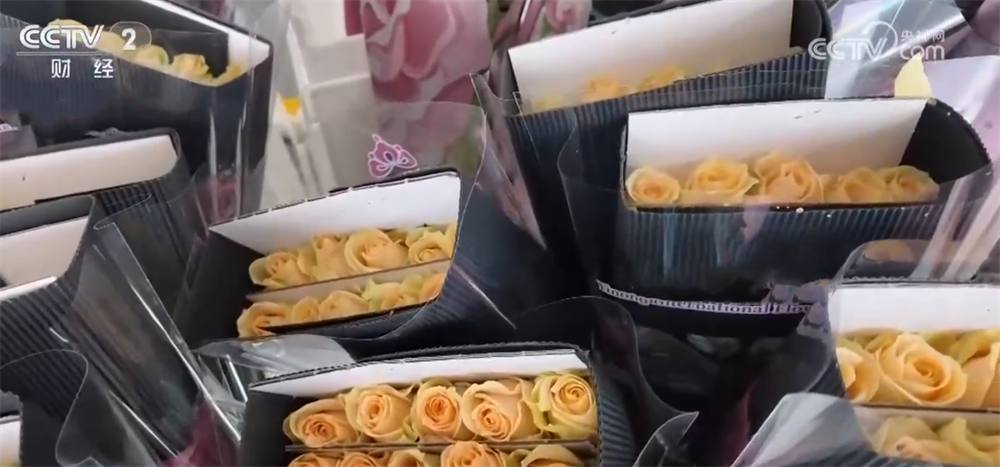 商家介紹,本月出口鮮花的發(fā)貨量是日常的五倍,目前訂單已經(jīng)排到年后。新鮮采摘的鮮花在出口商車間完成分揀、包裝、保鮮等處理后,由冷鏈送往機(jī)場(chǎng)過(guò)關(guān)出口,整個(gè)流程最快不到20小時(shí)就能完成。