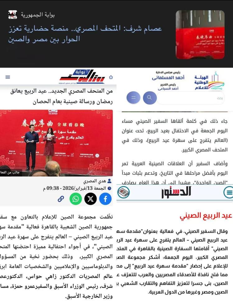 埃及國(guó)有媒體管理局官網(wǎng)以及開羅新聞電視臺(tái)、尼羅河電視臺(tái)、中東通訊社、《金字塔報(bào)》《共和國(guó)報(bào)》《今日埃及人報(bào)》《七日?qǐng)?bào)》《憲章報(bào)》《魯茲優(yōu)素福》雜志等埃主流媒體對(duì)活動(dòng)進(jìn)行了報(bào)道。