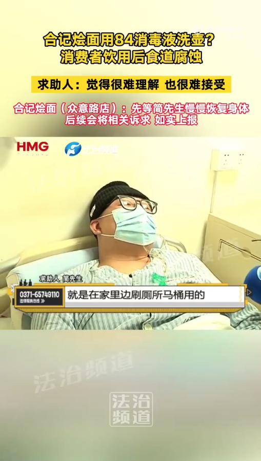 彼時,鄭州合記燴面眾意路店負責人接受媒體采訪時表示,店里平時不允許這樣做,服務(wù)員為了圖省事,私自將原本用作打掃衛(wèi)生的84消毒液,滴了一滴清洗水壺,另一名服務(wù)員在不知情的情況下拎上了餐桌。