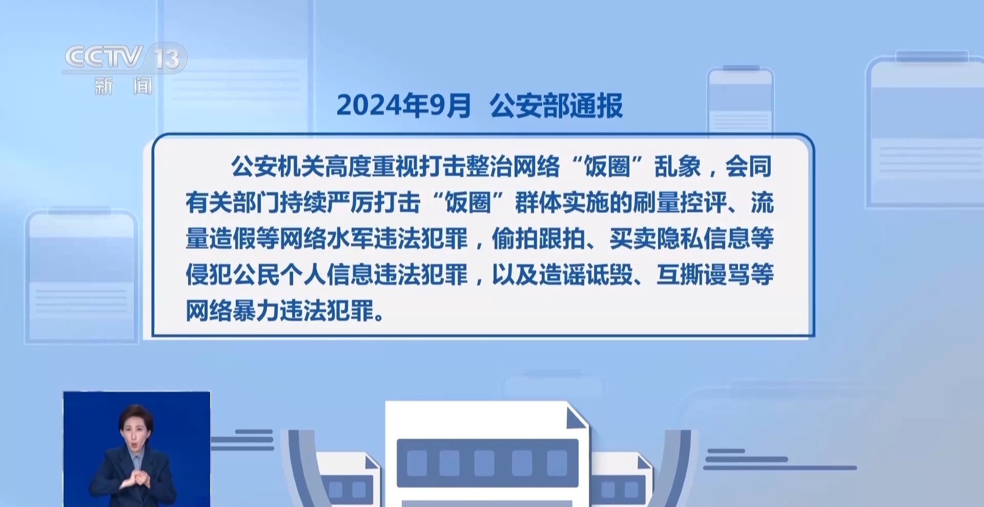 2024年9月,公安部通報,公安機關(guān)高度重視打擊整治網(wǎng)絡(luò)“飯圈”亂象,會同有關(guān)部門持續(xù)嚴厲打擊“飯圈”群體實施的刷量控評、流量造假等網(wǎng)絡(luò)水軍違法犯罪,偷拍跟拍、買賣隱私信息等侵犯公民個人信息違法犯罪,以及造謠詆毀、互撕謾罵等網(wǎng)絡(luò)暴力違法犯罪。