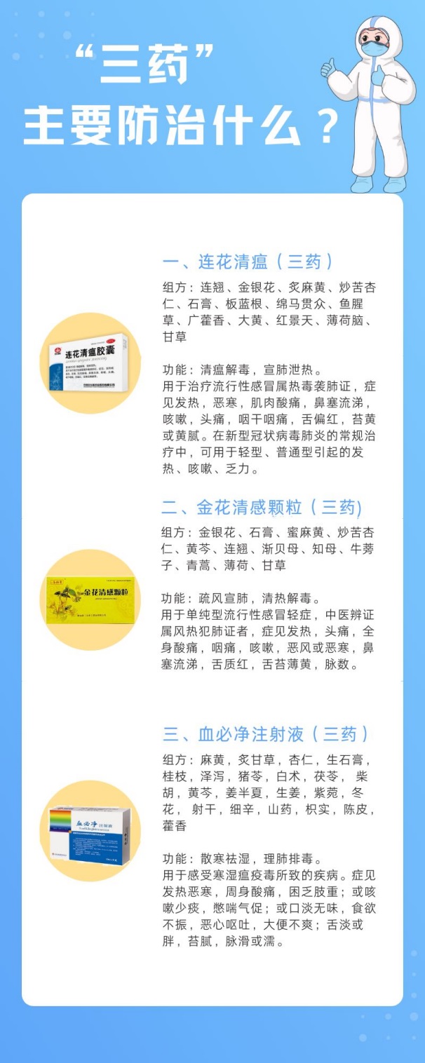 “三方”中的清肺排毒湯是源自于《傷寒論》的5個(gè)經(jīng)典方劑融合組成的,是國(guó)家診療方案中推薦的通用方劑?;瘽駭《痉胶托螖《痉绞窃谖錆h前線的臨床救治過程中,根據(jù)臨床觀察總結(jié)出來的有效方劑,也已獲批上市。準(zhǔn)確地說,目前“三方三藥”已成為了“六藥”。