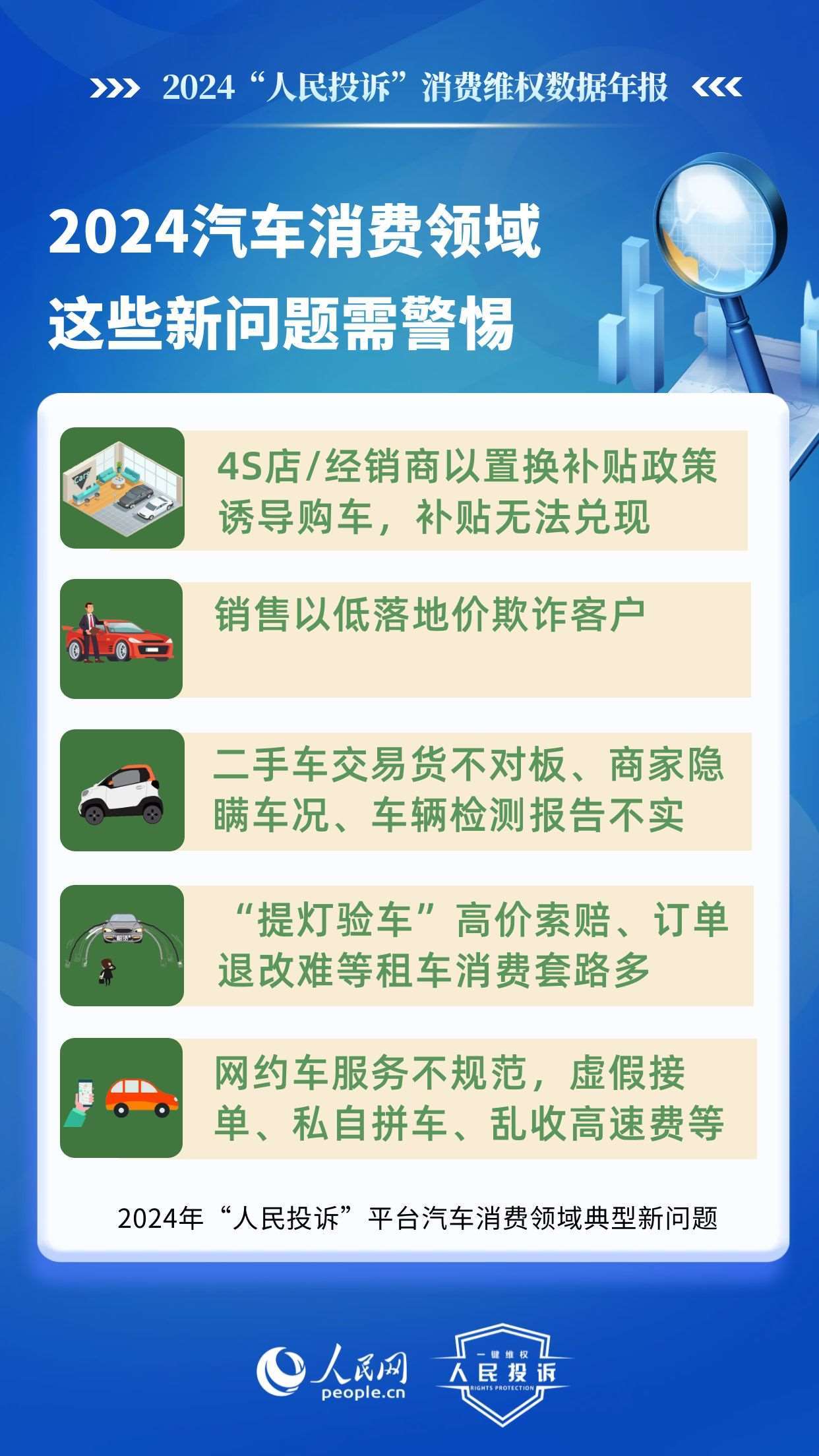 新問題體現(xiàn)在:4S店/經(jīng)銷商以置換補(bǔ)貼政策誘導(dǎo)購車,結(jié)果補(bǔ)貼無法兌現(xiàn);銷售以低落地價欺詐客戶;二手車交易貨不對板、商家隱瞞車況、平臺車輛檢測報(bào)告不實(shí);惡意租“故障車”、“提燈驗(yàn)車”高價索賠、低價誘租、訂單退改難等租車消費(fèi)套路多;網(wǎng)約車服務(wù)不規(guī)范,人車不符、虛假接單、私自拼車、亂收高速費(fèi)等。