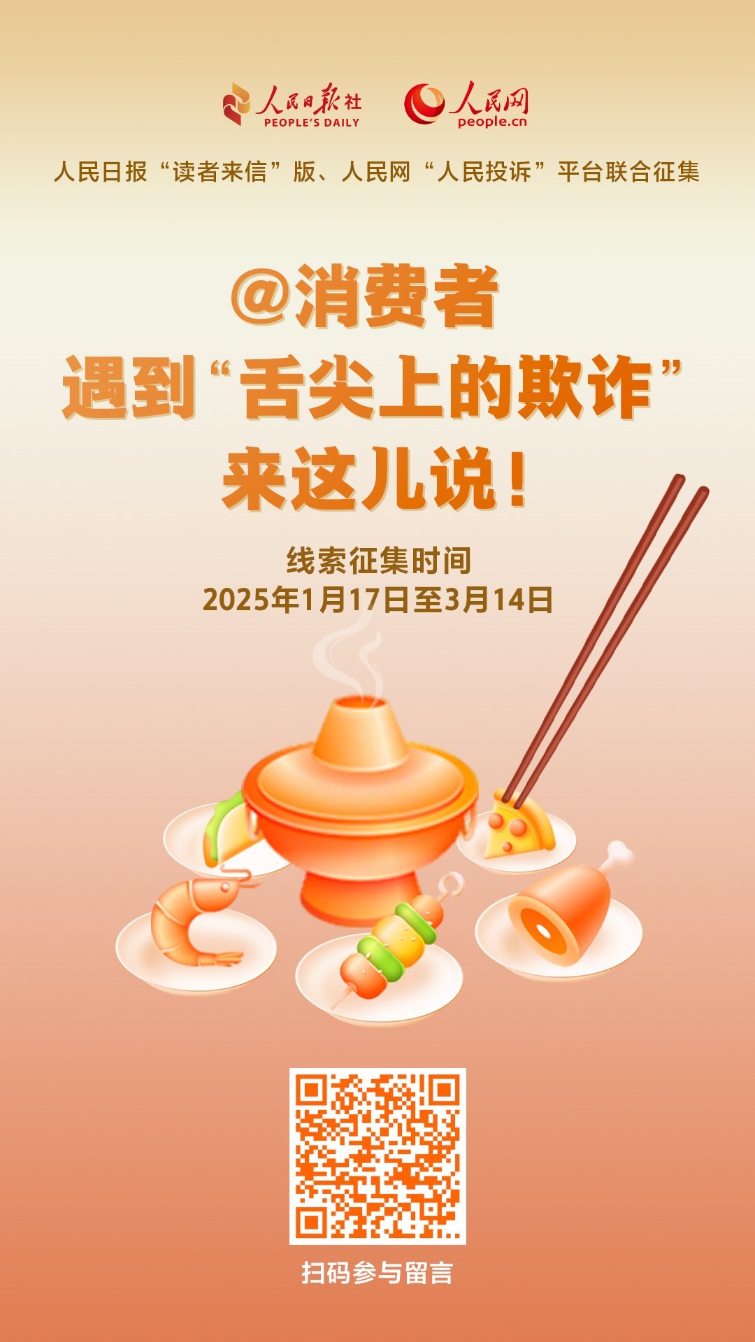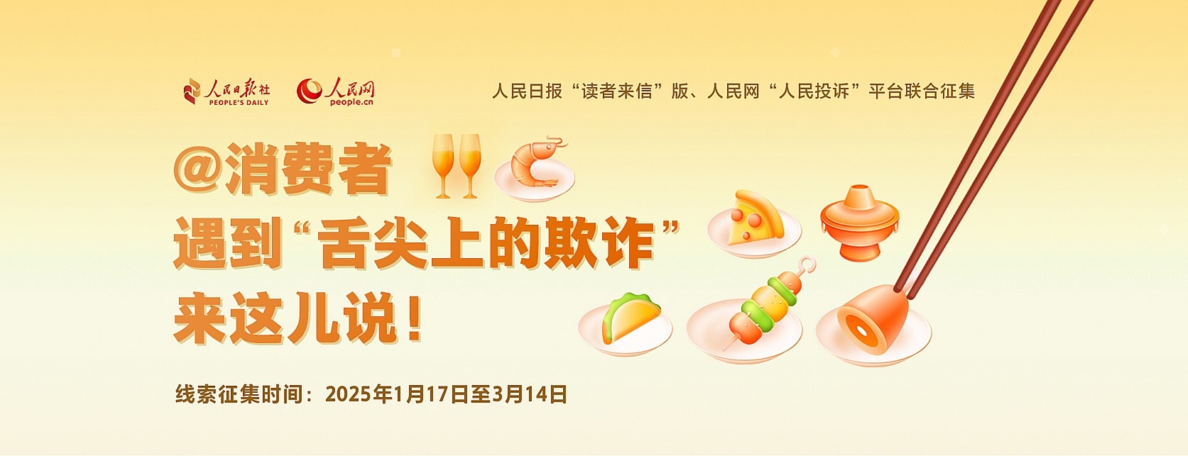 牛肉干里不含牛肉,無糖產(chǎn)品其實含糖,配料表造假、營養(yǎng)成分表不準(zhǔn)確……你遇到過嗎?“以假亂真”“以次充好”為代表的食品欺詐,嚴(yán)重?fù)p害消費者利益,擾亂市場公平競爭秩序。為筑牢食品安全防線,增強(qiáng)消費者信心,即日起,人民日報“讀者來信”版與人民網(wǎng)“人民投訴”平臺聯(lián)合發(fā)起相關(guān)線索征集,歡迎您掃描上方海報二維碼進(jìn)入征集頁面留言或提供調(diào)查線索至人民日報“讀者來信”版(郵箱:dzlx@peopledaily.cn 傳真:010-65368495)。線索征集時間截至2025年3月14日。