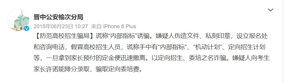 每年各省市投檔分數(shù)線公布后,總是“幾家歡喜幾家愁”,不法分子也在此刻瞄準了落榜考生。根據(jù)各地公安部門通報,一些不法分子假冒高校招生人員或聲稱“熟悉”高校招生辦,點對點與相關考生取得聯(lián)系。隨后謊稱有某高校的“內(nèi)部指標”“機動計劃”,或是以“定向招生”“委培招生”等名義“降分錄取”考生,誘騙其繳納相關費用。需要注意的是,在實施這些詐騙行為時,不法分子往往使用電腦合成技術偽造“招生文件”“學校公章”等,騙取考生及家長的信任。