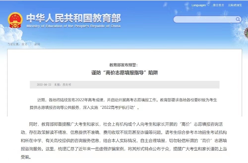 近日,教育部發(fā)布預警,提醒考生謹防“高價志愿填報指導”陷阱。有網(wǎng)站虛假宣傳擁有所謂“內(nèi)部信息”,自稱掌握內(nèi)部大數(shù)據(jù),能夠“精準定位院?!钡鹊?。事實上,每年高考填報志愿前,各省級招生考試機構都會發(fā)布當年高考成績統(tǒng)計情況和近年來各高校錄取分數(shù)情況,并不存在市面上的咨詢機構或個人聲稱的“內(nèi)部信息”。還有一些咨詢機構假冒所謂志愿填報專家身份。該咨詢機構打出廣告,稱團隊的專家“獲得高考志愿規(guī)劃師認證”“來自著名高?!钡?。事實上,有關部門從未發(fā)放過“高考志愿規(guī)劃師”這類職業(yè)資格證書。該機構一些所謂“志愿規(guī)劃師”都是臨時招募的社會人員,按照總部提供的“臺詞”給考生和家長輔導。家長購買這些機構的服務不僅花了冤枉錢,而且可能報錯志愿。