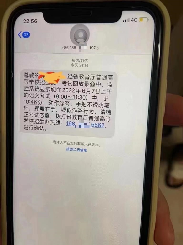 “尊敬的考生×××,經(jīng)省教育廳普通高等學校招生統(tǒng)一考試回放錄像中,監(jiān)控系統(tǒng)顯示您在2022年6月7日上午的語文考試(9:00—11:30)中,于10時46分,動作浮夸,手握不透明筆桿,揮舞右手,疑似作弊行為,請端正考試態(tài)度,撥打省教育廳普通高等學校招生辦熱線:188×××進行確認?!苯?,有考生向廈門警方反映,自己接到了聲稱是“省教育廳普通高等學校招生辦”的通知短信,懷疑是詐騙信息。該短信在開頭準確寫明了考生姓名,并在結尾要求考生主動撥電話號碼進行確認。經(jīng)與教育部門核實確認,高考作弊違規(guī)行為不會以短信、電話、鏈接等方式通知。廈門警方提醒,不法分子通過非正常渠道搜集到考生信息,并向考生發(fā)送所謂“疑似作弊”的通知短信,考生一旦回撥電話,就可能被不法分子以“處理作弊行為”為由實施詐騙?! ?/p>