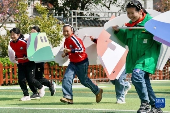 3月31日,徐州市漢橋小學(xué)的學(xué)生進(jìn)行“列車競速”游戲。