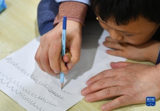 3月30日,在西安市金色陽光康復(fù)中心,特教老師指導(dǎo)孩子進(jìn)行繪畫練習(xí)。