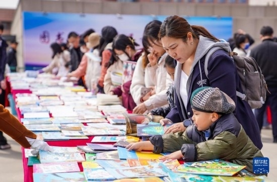 4月22日,市民在吉林省圖書館前的“換書大集”挑選圖書。