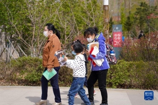 4月22日,一名小朋友在吉林省圖書館前的“換書大集”挑選圖書。