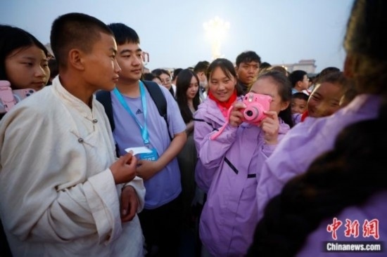 6月1日清晨的天安門(mén)廣場(chǎng),一群來(lái)自青海玉樹(shù)、身著傳統(tǒng)藏族服飾的孩子組成了一道亮麗的風(fēng)景線。