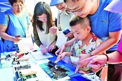 4月24日是“中國航天日”,海南文昌舉辦“氣象航天手牽手”系列科普活動,用各種趣味實驗和游戲讓觀眾了解航天知識。圖為小朋友和家長在文昌航天科普中心制作航天主題版畫。新華社記者 郭程攝