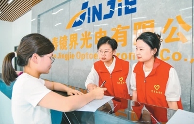 圖為近日,蒙山鎮(zhèn)黨員志愿者來到鏡界光電有限公司宣傳人才政策,指導企業(yè)申報相關人才項目。
