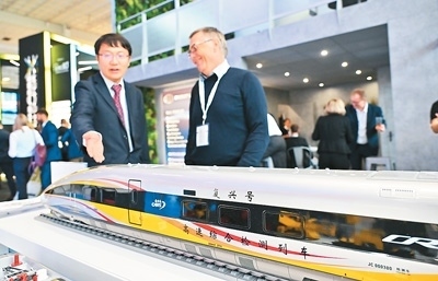 | 日前,在德國(guó)柏林軌道交通展上,中國(guó)鐵道科學(xué)研究院集團(tuán)有限公司工作人員(左)向參觀者介紹復(fù)興號(hào)高速綜合檢測(cè)列車模型。新華社發(fā) |