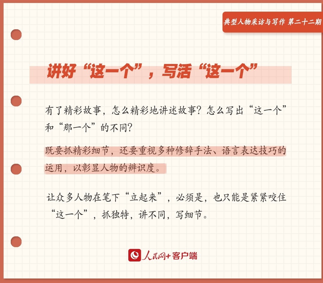 把好故事講精彩,讓“這一個”立起來,既要抓精彩細(xì)節(jié),還要重視多種修辭手法、語言表達(dá)技巧的運用,以彰顯人物的辨識度。