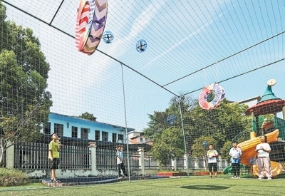 | 航模隊(duì)隊(duì)員在操場(chǎng)上進(jìn)行無(wú)人機(jī)足球?qū)官?。李桂東攝(人民視覺(jué)) |