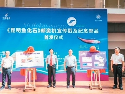 2023年5月,《昆明魚化石》郵資機宣傳戳及系列紀念郵品在西北大學博物館首發(fā)。此次啟用的《昆明魚化石》郵資機宣傳戳,是以中國科學院院士、西北大學教授舒德干團隊發(fā)現(xiàn)的鳳姣昆明魚化石為原型設計制作。鳳姣昆明魚距今已5.18億年,是已知最古老的脊椎動物。該魚的發(fā)現(xiàn),為揭示寒武紀大爆發(fā)奧秘、破解遠古生命演化謎團提供了獨特的劃時代里程碑證據(jù)。圖為首發(fā)儀式現(xiàn)場。中新社發(fā)