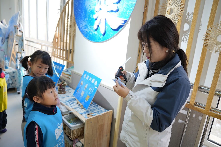 劉曉菲表示,利用幼兒園走廊寬的優(yōu)勢,把一樓打造成閱讀長廊,二樓藝術(shù)長廊,包括扎染、剪紙、造紙、拓印等非遺項目,三樓創(chuàng)造長廊,包括卡卡建構(gòu)、炫彩建構(gòu)、扭扭建構(gòu)、墻釘游戲、機械探索等。