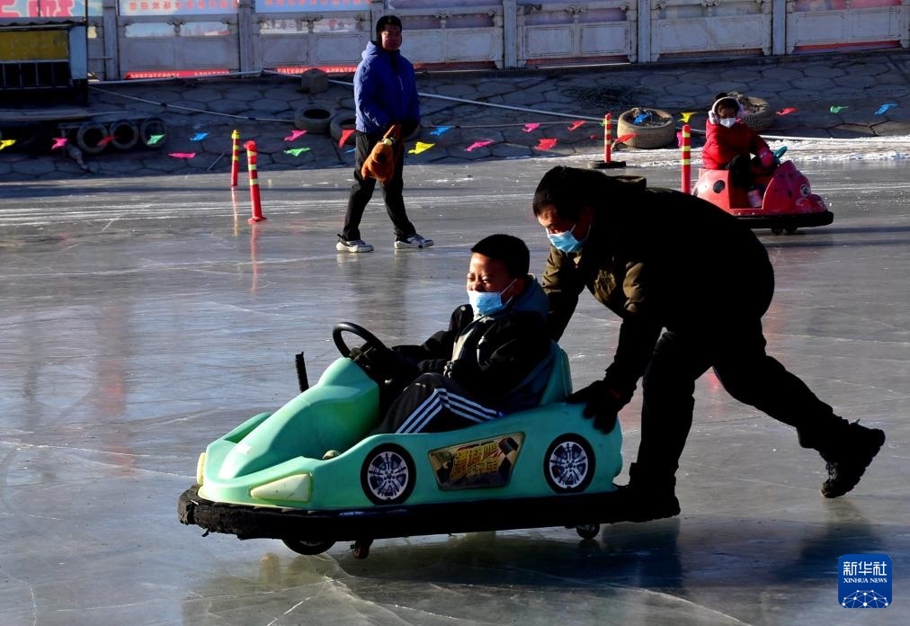 12月21日,人們?cè)诟拭C省酒泉市肅州區(qū)錦玉公園滑冰場(chǎng)嬉戲。
