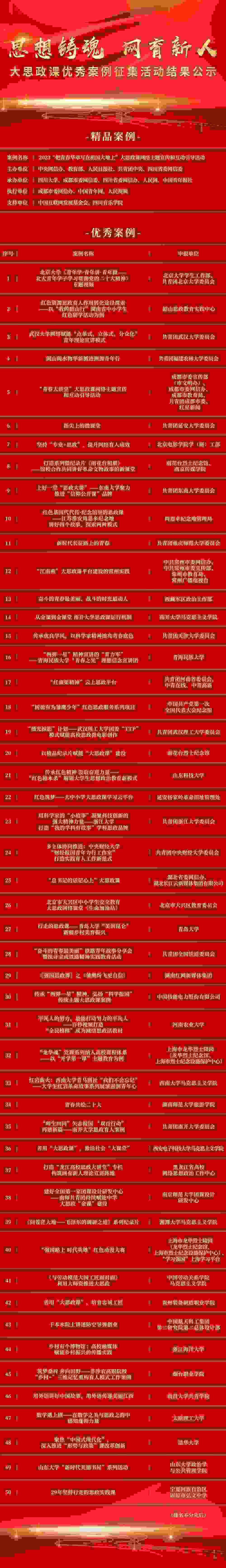 由中央網(wǎng)信辦網(wǎng)絡傳播局、共青團中央宣傳部指導,人民網(wǎng)、中國青年報社共同主辦的“思想鑄魂 網(wǎng)育新人”大思政課優(yōu)秀案例征集活動評選結果已經(jīng)產(chǎn)生,現(xiàn)對擬入選案例進行公示,公示時間為1月20日至1月24日,公示期間歡迎社會各界監(jiān)督評議,有關意見可發(fā)送至郵箱eduyouth@163.com,我們將及時受理、認真核查,公示期滿后將適時對外發(fā)布最終結果。