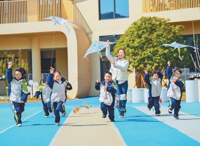 浙江省湖州市長興縣泗安鎮(zhèn)中心幼兒園,孩子們和老師一起放飛彩繪風箏。
