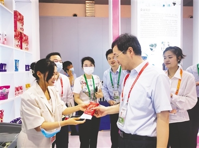第二屆中國國際消費品博覽會(以下簡稱消博會)在海南省??谑信e辦。內(nèi)蒙古展館的綠色優(yōu)質(zhì)產(chǎn)品引來圍觀。蒙牛乳業(yè)、敖漢小米、科爾沁牛肉、芥花油等內(nèi)蒙古多個綠色優(yōu)質(zhì)品牌及產(chǎn)品亮相消博會。同時,70多家交易商組成內(nèi)蒙古展團(tuán)觀展。本屆消博會主題為“共享開放機(jī)遇共創(chuàng)美好生活”,于7月25日開幕,為期6天。(文/圖 本報記者 李永桃)
