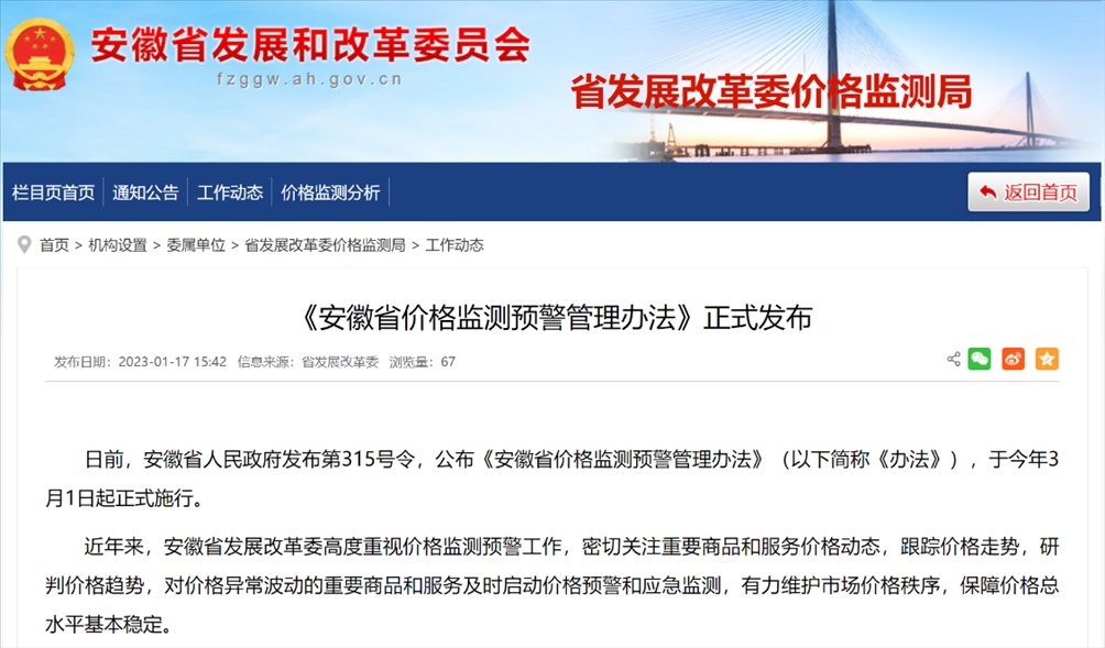 《安徽省價(jià)格監(jiān)測預(yù)警管理辦法》。圖片來源:安徽省發(fā)展和改革委員會