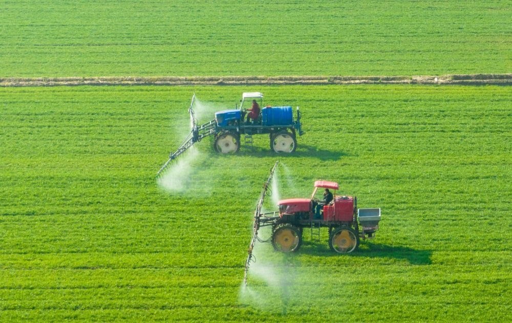 2月28日,在江蘇省海安市大公鎮(zhèn)王院村,村民駕駛植保機(jī)在小麥田間進(jìn)行噴灑藥物作業(yè)(無人機(jī)圖片)。新華社發(fā)(翟慧勇 攝)