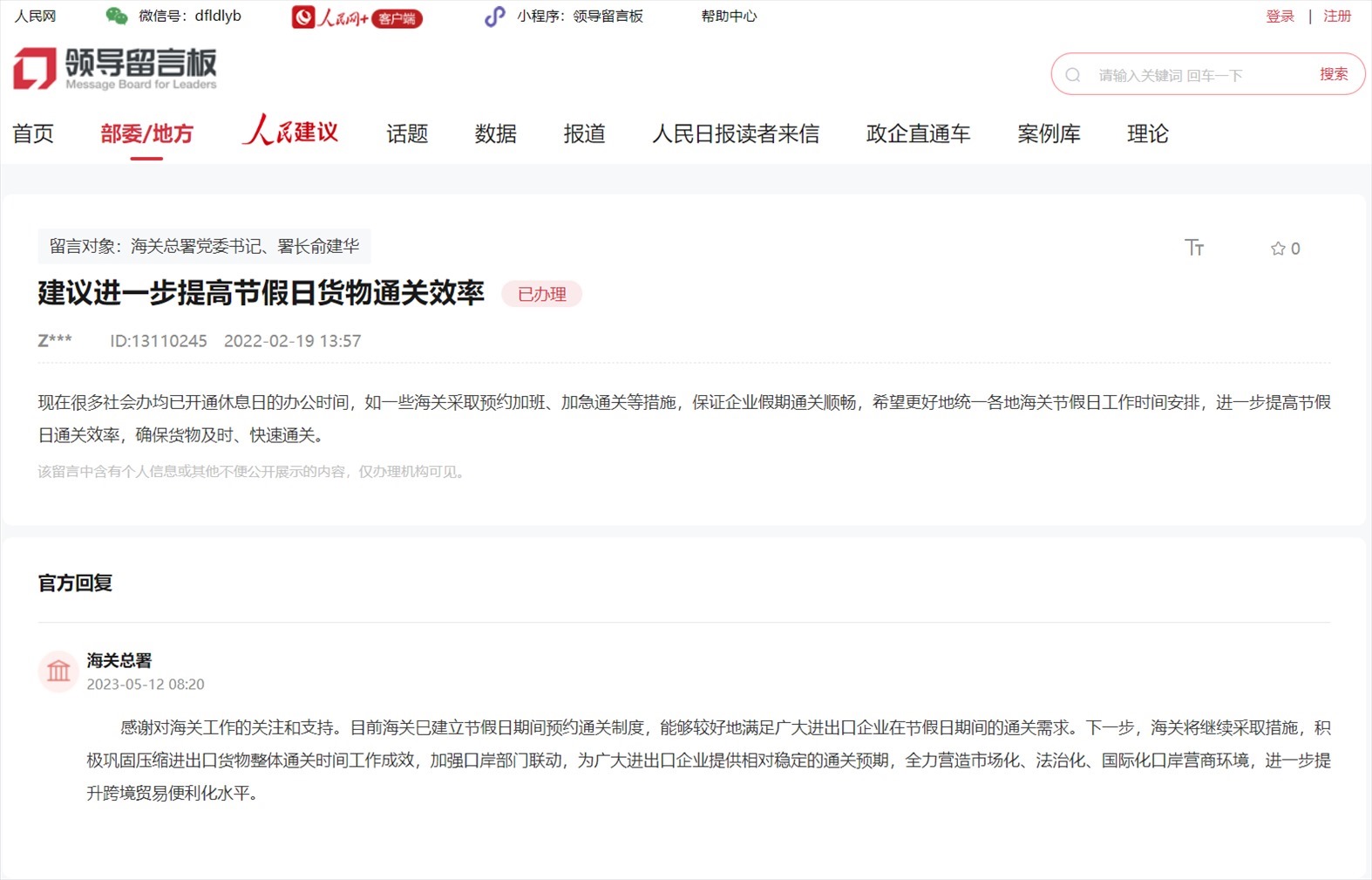 近日,網(wǎng)友通過人民網(wǎng)“領(lǐng)導(dǎo)留言板”對(duì)全國海關(guān)積極建言獻(xiàn)策,包括外來物種入侵、進(jìn)一步提高節(jié)假日貨物通關(guān)效率等方面。