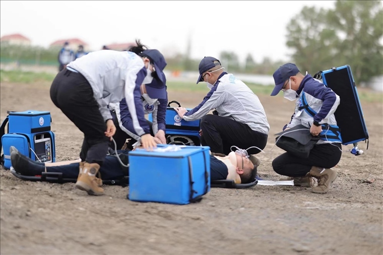 他們首先將模擬航天員抬到鏟式擔(dān)架上,迅速作出病情判斷后,立即護(hù)送進(jìn)入救護(hù)直升機(jī)??紫殄|發(fā)出指令,趙琳輸送氧氣,朱明開始心電監(jiān)測,高曉佩建立靜脈通道……。經(jīng)初步驗(yàn)傷,按照原定救治程序展開急救……演習(xí)于第二天上午10時結(jié)束,返回駐地,大家立刻顧不上休整,又迅速對演練進(jìn)行復(fù)盤。