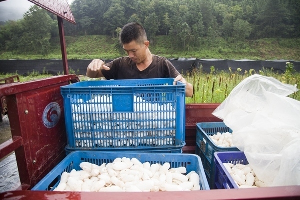 種植戶把采摘好的竹蓀分批裝回加工基地。