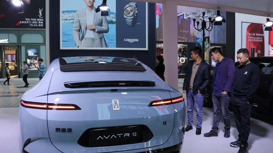 新上市的新能源汽車(chē)長(zhǎng)安阿維塔12雙動(dòng)力車(chē)型吸引往來(lái)游客。新華社記者趙小帥 攝
