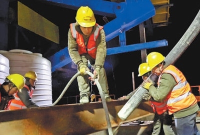 寒風(fēng)勁吹,杭州灣跨海鐵路大橋建設(shè)現(xiàn)場(chǎng)依舊熱火朝天,千余名建設(shè)者正在緊張地進(jìn)行大橋橋墩墩身施工作業(yè)。