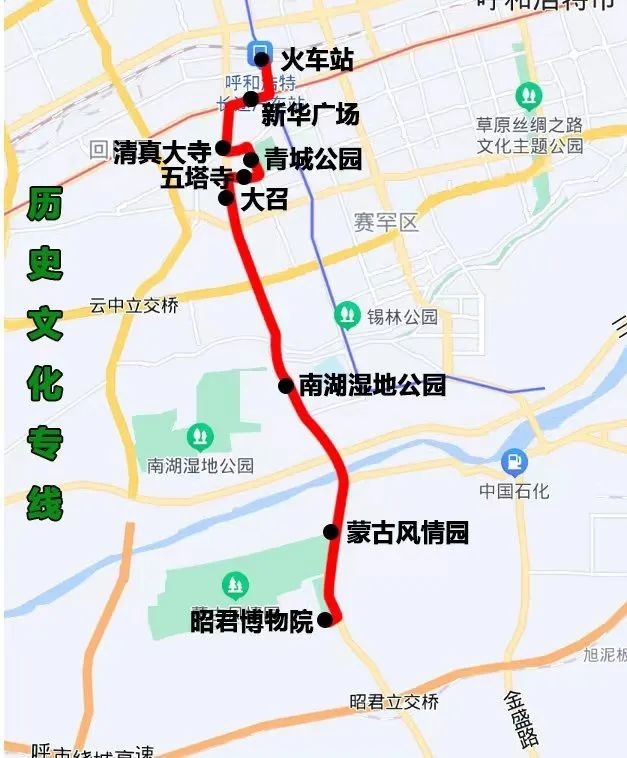 歷史文化專線(火車站——昭君博物院)途經:錫林北路、新華大街、通道南路、中山西路、石羊橋路、大東街、大北街、大南街、昭君路。沿途設站:火車站、新華廣場、清真大寺、青城公園、五塔寺、大召、南湖濕地公園、蒙古風情園、昭君博物院,單程:17.2公里,配車:8臺。
