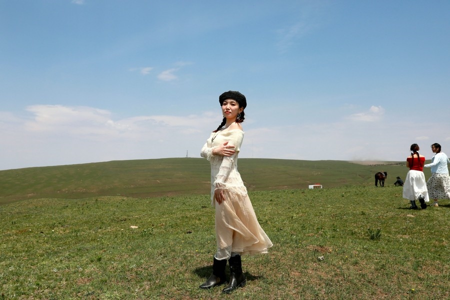 演員演出間隙在草原上拍照打卡 記者 張楊攝影