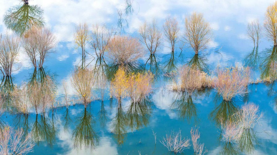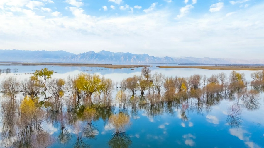 秋冬交替之際,位于呼和浩特土默特左旗的哈素海,水天一色,樹影倒映,構(gòu)成一幅美麗的水彩畫卷,猶如人間仙境。 樂炎 攝影