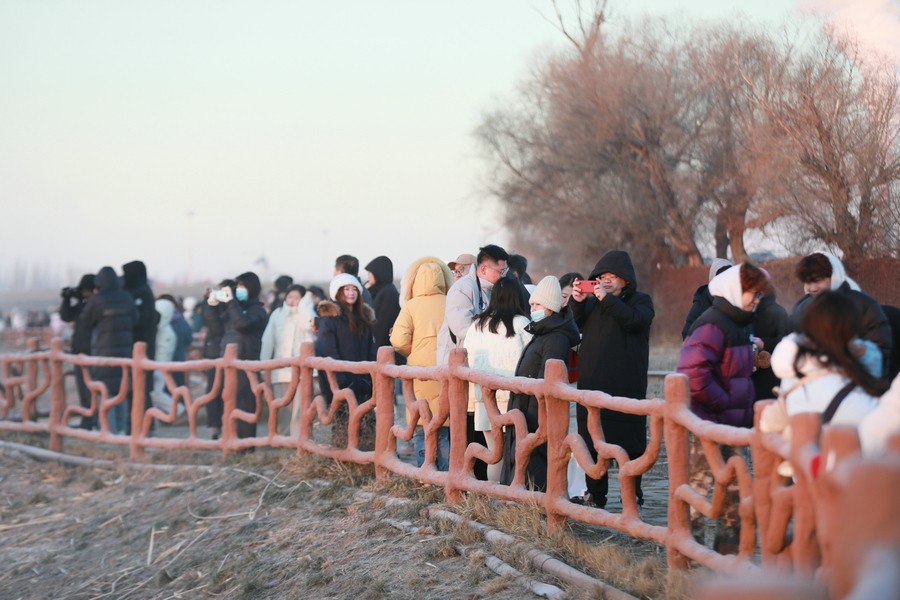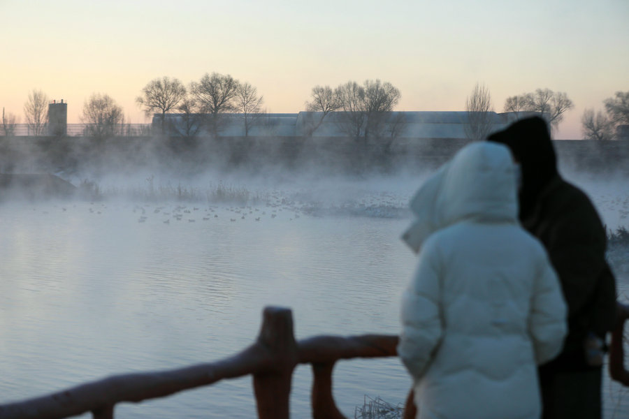 12月15日清晨,上千名游人在呼和浩特玉泉區(qū)班定營村南側(cè)的塞外“千島湖”畔賞景打卡。此處湖水為城市污水經(jīng)處理達(dá)標(biāo)后的再生水,隆冬時(shí)節(jié),再生水流入湖中,水汽蒸騰,岸邊草木霧凇皚皚,良好的生態(tài)吸引了數(shù)萬只赤麻鴨在此翔集棲息,構(gòu)成一幅生動(dòng)和諧的美麗畫面。每日清晨,都有上千名游客來此觀日出賞美景。