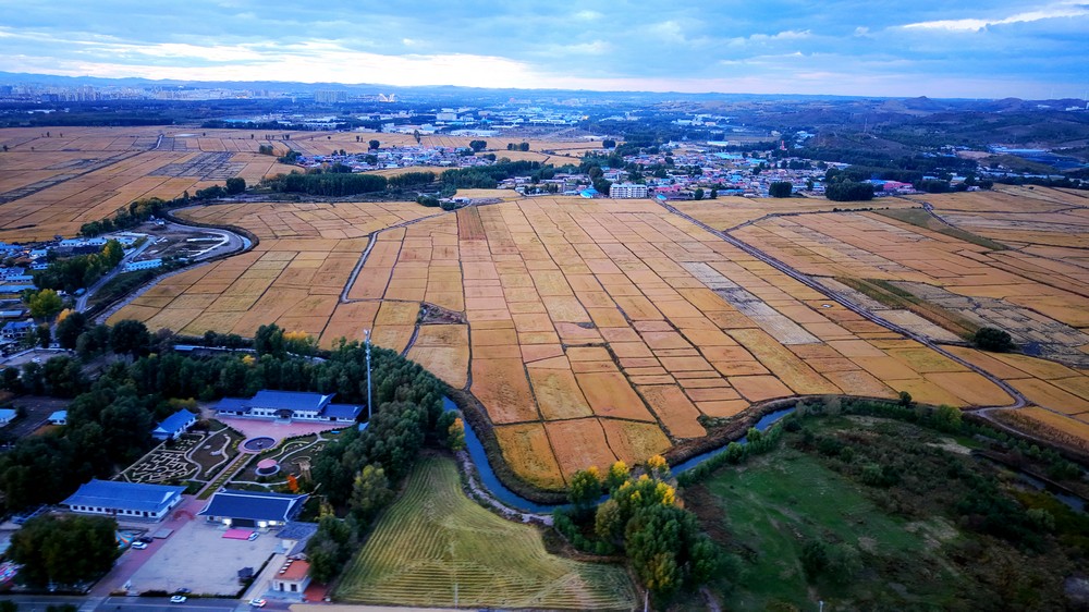 9月25日,空中俯瞰暮色中的三合村,遠(yuǎn)山如黛,稻田如畫,金色的麥浪,映襯著豐收的底色。