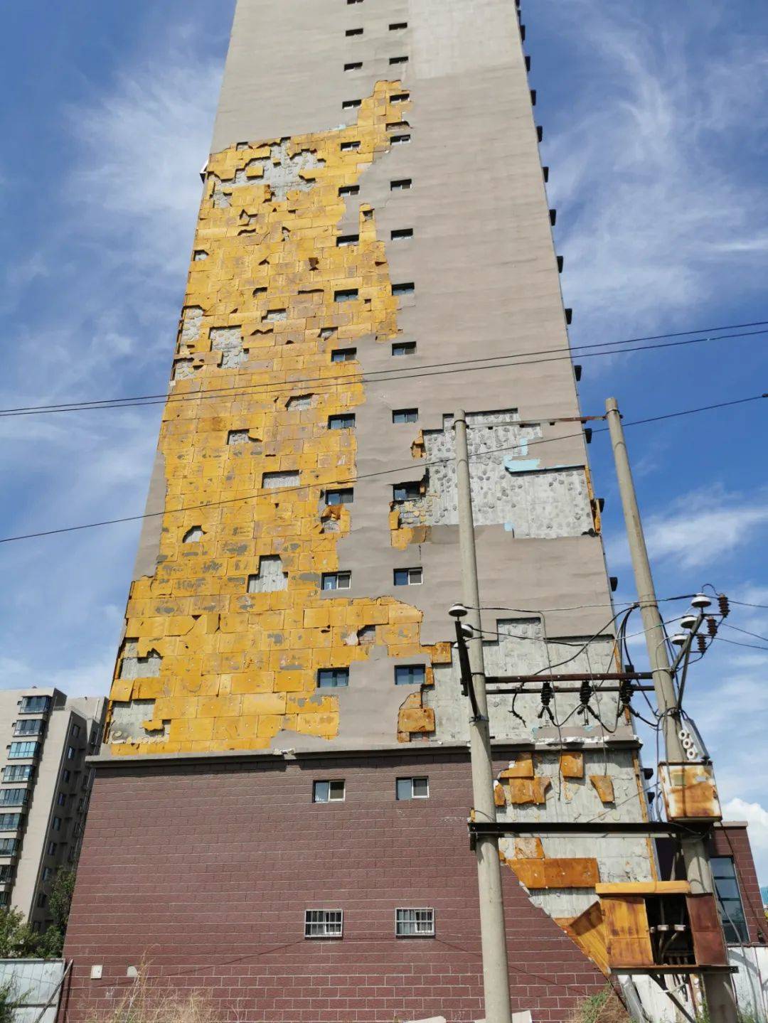 7月1日10時許,記者來到聞都雅苑4號樓下,抬頭望去,該棟樓西側(cè)墻壁有三處地方出現(xiàn)破損,大片的墻皮和里面的保溫層均已脫落。記者注意到,聞都雅苑共有4棟高層,該小區(qū)只有東西和南北兩條主干道以及西側(cè)一條小走廊,而4號樓正好位于南北主干道一側(cè)。據(jù)小區(qū)居民郝先生介紹,不斷掉落的保溫層已經(jīng)威脅到了居民的人身安全。今年5月6日,呼和浩特市出現(xiàn)大風(fēng)天氣,在風(fēng)力的作用下,4號樓東西兩側(cè)的外墻保溫層出現(xiàn)大面積脫落,一位恰巧路過4號樓西側(cè)的女性業(yè)主不幸被掉落的材料砸中,導(dǎo)致腿部受傷,此事也給小區(qū)居民帶來了恐慌。