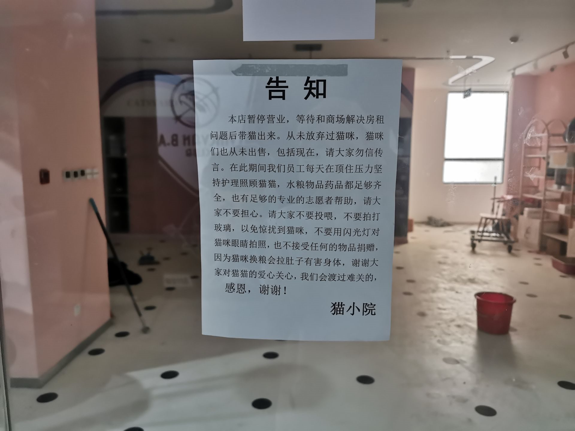 7月1日下午,記者來到貓小院貓咖,大門緊鎖,貼著暫停營(yíng)業(yè)的字樣。店內(nèi)昏暗無光,無人在場(chǎng)管理,透過玻璃櫥窗可以看到地面堆滿貓毛和污漬,甚至有打翻倒扣在地面的飲料杯,隔著門縫可以聞到明顯異味,幾十只貓咪滯留在店內(nèi),無精打采,有些貓咪的耳鼻眼處明顯存在淚痕、黑痂,疑似患有耳螨、鼻支等病。記者注意到,該店在美團(tuán)上的套餐已下架,撥打店內(nèi)座機(jī)顯示“電話已欠費(fèi)停機(jī)”,無法與店主取得聯(lián)系,記者與周邊其他店主進(jìn)行溝通后了解到,該店疑似存在拖欠房租、人員工資等情況,貓咪留在店內(nèi)無法帶走,有人會(huì)定期進(jìn)行照料?!耙婚_門附近的店都得關(guān)門”,周邊商戶抱怨道。