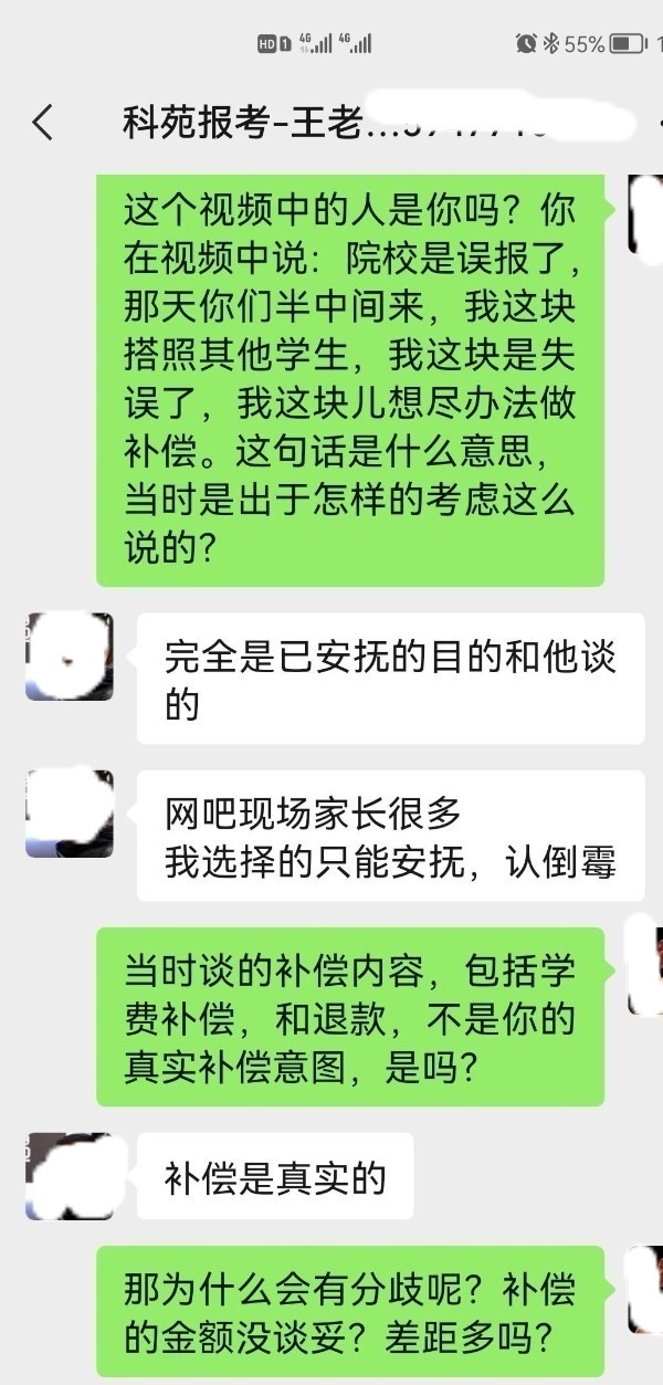 據(jù)樊女士介紹,負責(zé)給小安報志愿的是科苑報考的王金寶老師,也是內(nèi)蒙古科苑信息科技有限公司的股東之一。樊女士提供的視頻顯示,這名老師在網(wǎng)報志愿現(xiàn)場回復(fù)樊女士:“院校就是誤報了,因為那天你們是半中間來,還有其他學(xué)生,搭照學(xué)生,我這塊兒就失誤了,我這塊兒想盡辦法做補償?!比欢?,樊女士反映,那天以后,這名老師開始反口,不承認誤報,也不愿意按照當天商定的補償方案執(zhí)行。