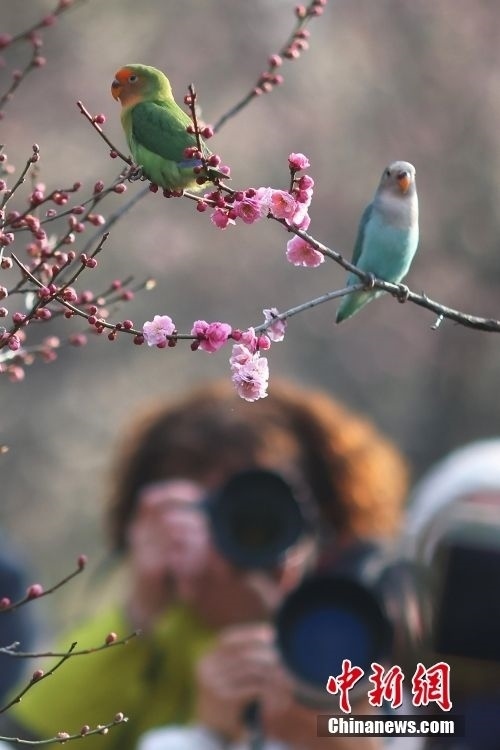 2月20日,江蘇南京,牡丹鸚鵡在梅花山梅花樹上“賞”梅。牡丹鸚鵡由南京一市民飼養(yǎng),每年在梅花盛開的時候,他都會帶著鸚鵡來到這里“賞”梅,同時也成為一景。中新社記者 泱波 攝