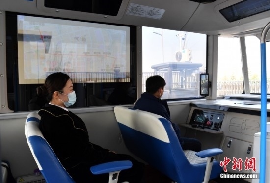 2月22日,智能網(wǎng)聯(lián)巴士901線測試車輛??抗徽九_(tái)。雄安新區(qū)的智能網(wǎng)聯(lián)巴士近期正在進(jìn)行投入運(yùn)營前的道路測試,該巴士配備了超高感度攝像頭、超聲波雷達(dá)、激光雷達(dá)、毫米波雷達(dá)等感知設(shè)備,組成了車輛的“眼睛”。車輛可自主識(shí)別紅綠燈、道路提示牌和車道標(biāo)線等,做出跟車、超車、停車等動(dòng)作。中新社記者 韓冰 攝