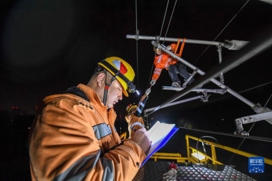 2月23日,一名綜合維修工在滬寧城際高鐵南京站至仙林站區(qū)間記錄接觸網檢修維護情況。