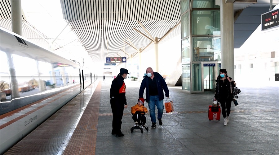 “旅客們出門在外,難免遇到一些問題,我做的雖然不是驚天動地的大事兒,但只要能幫到別人,我就覺得很開心?!?023年1月,正在站臺巡視的陳甜甜發(fā)現(xiàn)一位手拿拐杖的旅客顫巍巍地走近列車,她主動上前詢問。原來,這位旅客是一名盲人,獨自一人準(zhǔn)備從北京乘車回包頭。為更好地照顧這位特殊的旅客,陳甜甜帶著他尋找座位、幫他放置行李。乘車途中,陳甜甜還細(xì)心地請男乘務(wù)員同志帶他如廁方便,讓對方感到無微不至的關(guān)懷。