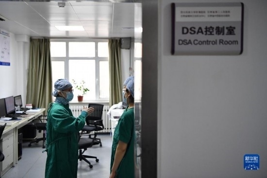 3月7日,馬娜(右)和同事在手術(shù)室為患者進(jìn)行介入手術(shù)治療。