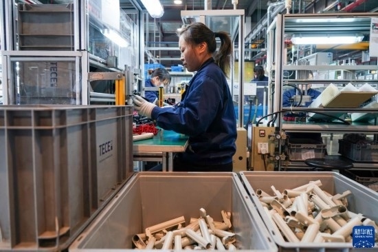 工人在位于太倉(cāng)市高新區(qū)的帝希潔具系統(tǒng)(蘇州)有限公司生產(chǎn)車間內(nèi)進(jìn)行加工作業(yè)(3月16日攝)。