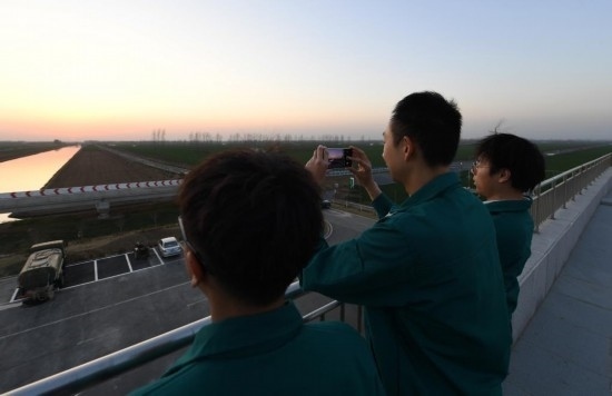 3月14日,在西平縣老王坡高標(biāo)準(zhǔn)服務(wù)中心的二樓平臺,臺曉林(右)、王英凡和王仲琦(左)下班后在看夕陽。