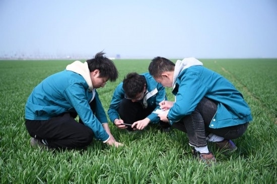 2月28日,在西平縣老王坡高標(biāo)準(zhǔn)農(nóng)田示范區(qū),臺曉林(左)、王仲琦和王英凡(右)一起觀察苗情草情并記錄。