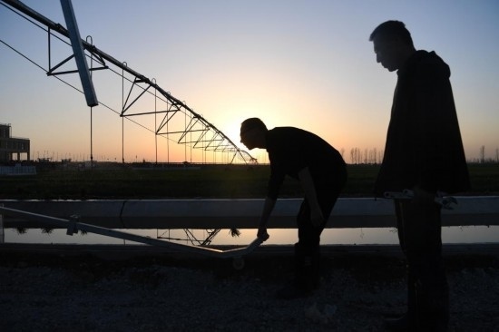 3月14日,在西平縣老王坡高標(biāo)準(zhǔn)農(nóng)田示范區(qū),劉亞輝(左)在調(diào)整噴灌機(jī)的移動方向。